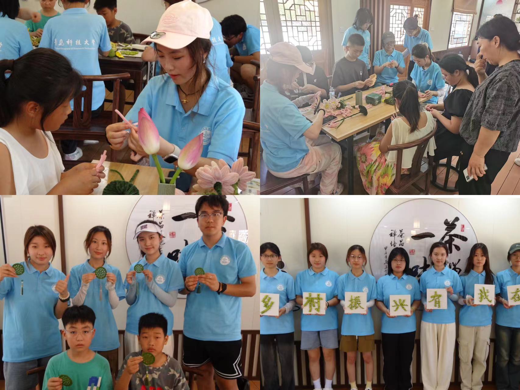 微山湖水系密布,阳光充沛,是荷花生长的天然佳地。池塘和湖边荷花、荷叶和莲蓬随处可见。实践队员们融合乡土资源,将采摘的新鲜荷花、莲子和实践前准备的手工材料相结合,进行以“荷”为主题的手工艺术创作,探索创意文旅新路径。实践队员们的手工艺术创作吸引到了当地村民和儿童参与,大家在队员们的带领下一起头脑风暴探索创新与荷相关手工。最后制作出来的精美逼真的荷花扭扭棒、独具创意的莲蓬书签、形象生动的莲子书画极大地拓宽了当地文旅手工创作新思路,极大地提高了当地村民发现美、认识美、创造美的能力。
