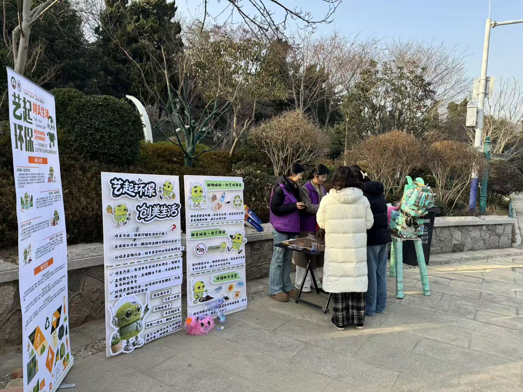 项目始终坚持走出校园,把环保美育融入社会生活。结合“百万老员工进社区”计划,团队带着设计好的宣传易拉宝、旧物改造手作、种子炸弹等物料,走进青岛多个社区、中小学和城市公园,开展环保宣讲与创意工作坊。