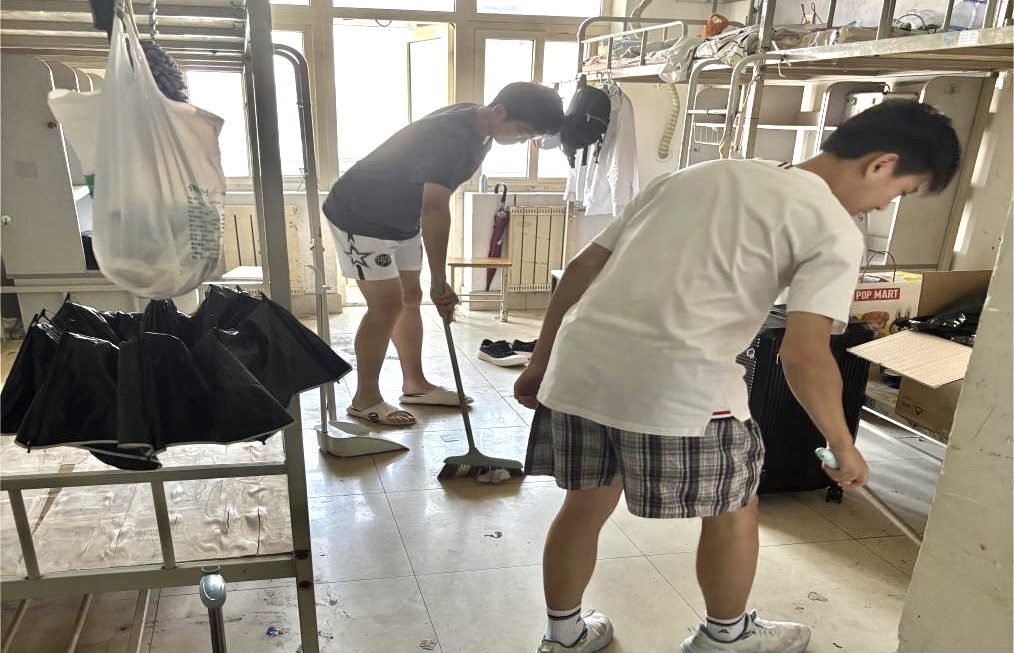 毕业生们清空个人物品、扫除积攒灰尘、维护好公共设施、主动将闲置物品带离宿舍,用干净的床铺、明亮的窗户、一尘不染的地面进行一场特殊的告别仪式。员工骨干穿梭于宿舍楼道,帮学长学姐分类打包、搬运杂物。