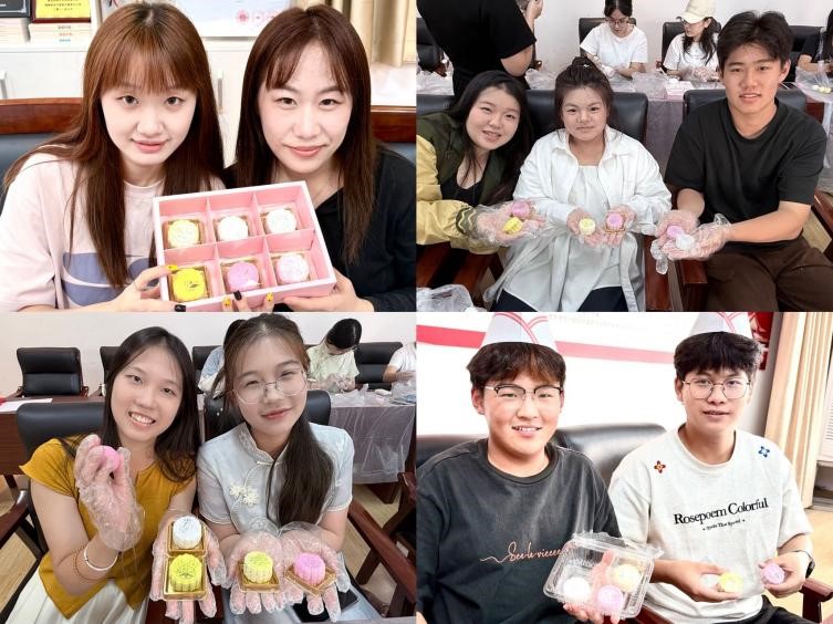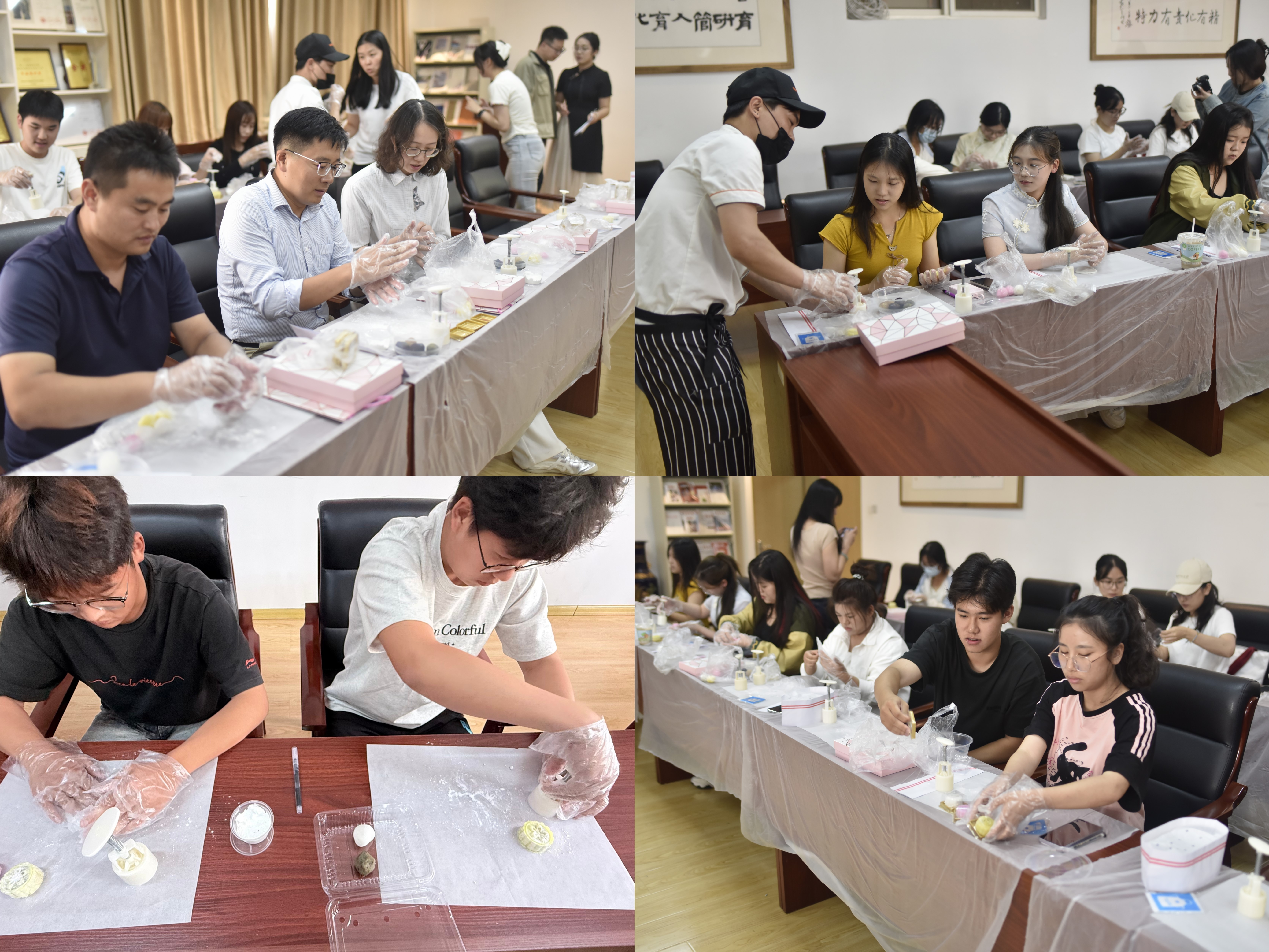 手作月饼环节,在专业师傅的演示指导下,从揉制面团、包裹馅料到压模成型,师生们热火朝天开启制作,大家分工协作、互相帮助,现场氛围十分温馨,同学们热情展示自己的作品,大方合影留念。