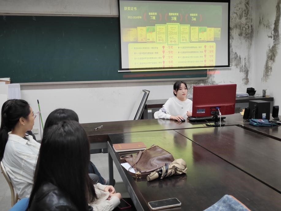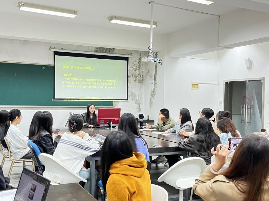 随后,由23级研究生们进行经验分享。吴伟康以赛事选择为切入点进行分享,分别为大家讲述了A类与B类赛事以及命题与非命题赛事的要求与注意事项。李环宇则对赛事进行分析,将准备过程分为设计前期与后期,讲解设计思路的创建。洪莺歌从比赛作品出发,着重介绍了设计概念、设计策略以及方案完善三个方面。朱高丽则以传统文化作为切入点,讲到文化赛事要在传承的基础上进行创新。最后,刘雪如围绕主办单位、主题要求、初评投稿、照片打印、尺寸要求五个方面,强调了作品版式的重要性以及提升画面吸引力的方法。在刘雪如对同学们的衷心祝愿中,此次讲座落下帷幕。