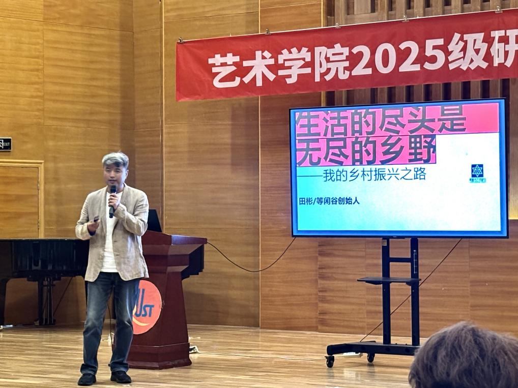 优秀员工代表田彬与研究生们亲切交流,回忆员工时代的美好生活,言语之间尽显对母校的深情与热爱,用自己的切身经历向同学们传授创业经验。从创业初的艰辛到后期调整目标定位,田彬紧密跟随国家乡村振兴战略,创立了“等闲谷艺术粮仓”,将生态文明与文化艺术相结合,走出了一条文旅产业与乡村振兴融合发展的特色道路。他的事迹为研究生们提供了很好的榜样,让大家对艺术之路有了开拓性的认识。