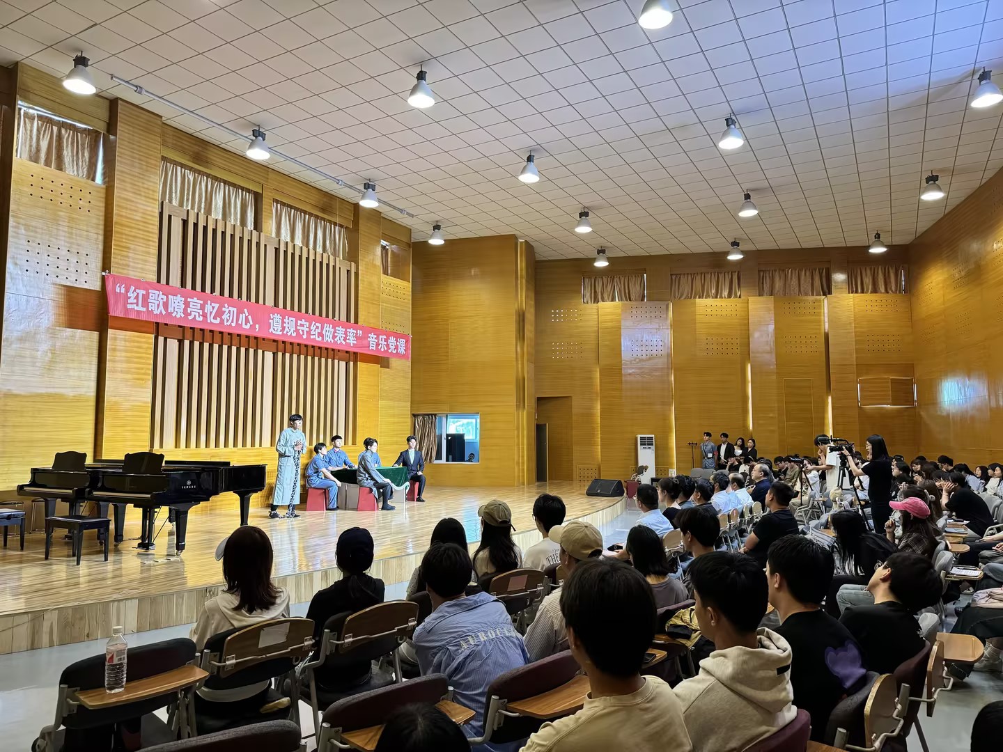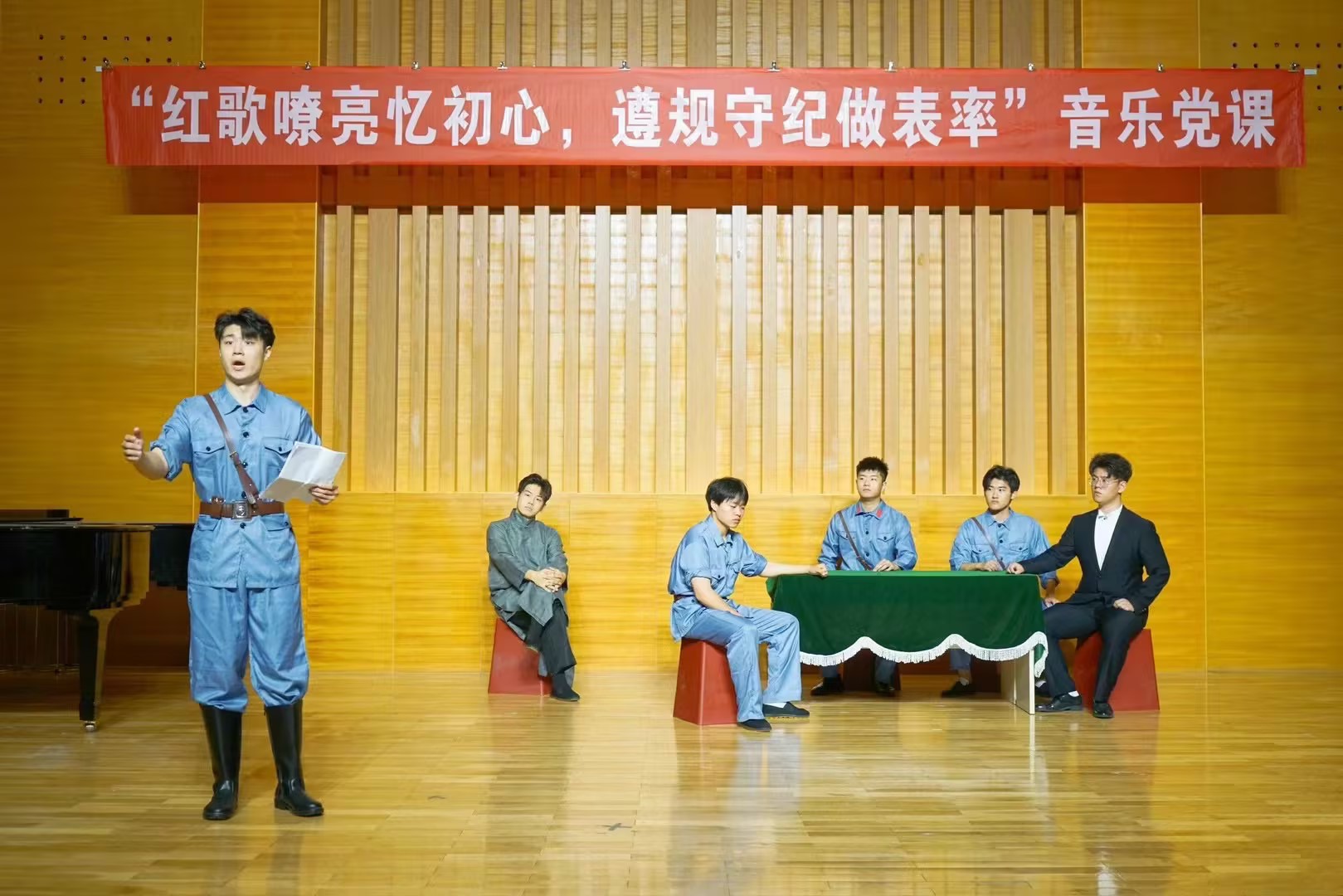此次音乐党课采用“主持人述说+演员表演唱”的形式,共分为革命烽火、鱼水深情和清风正气三个篇章。第一篇章《革命烽火》选取了歌剧《八一起义》的部分经典唱段,带领现场观众回顾那段惊天动地的伟大历史,缅怀革命先烈不怕牺牲、英勇斗争的大无畏精神。第二篇章《鱼水深情》选取了歌剧《沂蒙山》的部分经典唱段,再现了沂蒙山革命根据地军民用生命和鲜血谱写的可歌可泣、气壮山河的英雄赞歌,沉浸式感受抗日军民“水乳交融、生死与共”的沂蒙精神。第三篇章《清风正气》演唱了《我爱你塞北的雪》《把一切献给党》《江山》《老师的目光》等脍炙人口的歌曲,表达了师生党员不忘初心,牢记使命,拒腐防变永葆忠诚,遵规守纪争做表率的政治自觉。精彩的剧情、精湛的表演、深情的歌唱,博得了现场观众的热烈掌声。