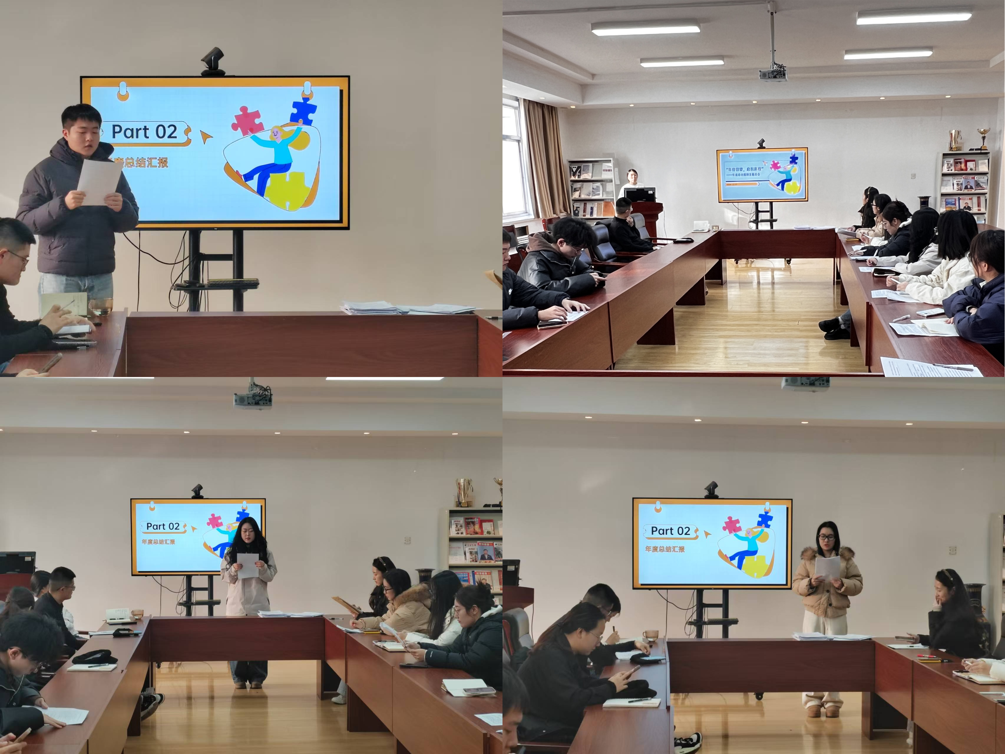 会上,辅导员宋晨曦带领同学们回顾了从新生入学季到期末以来共同经历的点滴和成长历程,同学们从刚入学的新奇、迷茫慢慢沉淀下来,找到自己的方向。同学们一一上台进行年度总结汇报,分享入学以来的成长故事,畅谈来年在班级工作和个人成长方面的目标规划。最后,宋晨曦对参会的员工干部进行了工作能力提升培训,传授文稿写作经验、明确班级工作重点难点,鼓励员工干部在做好工作的同时积极提升自我。
