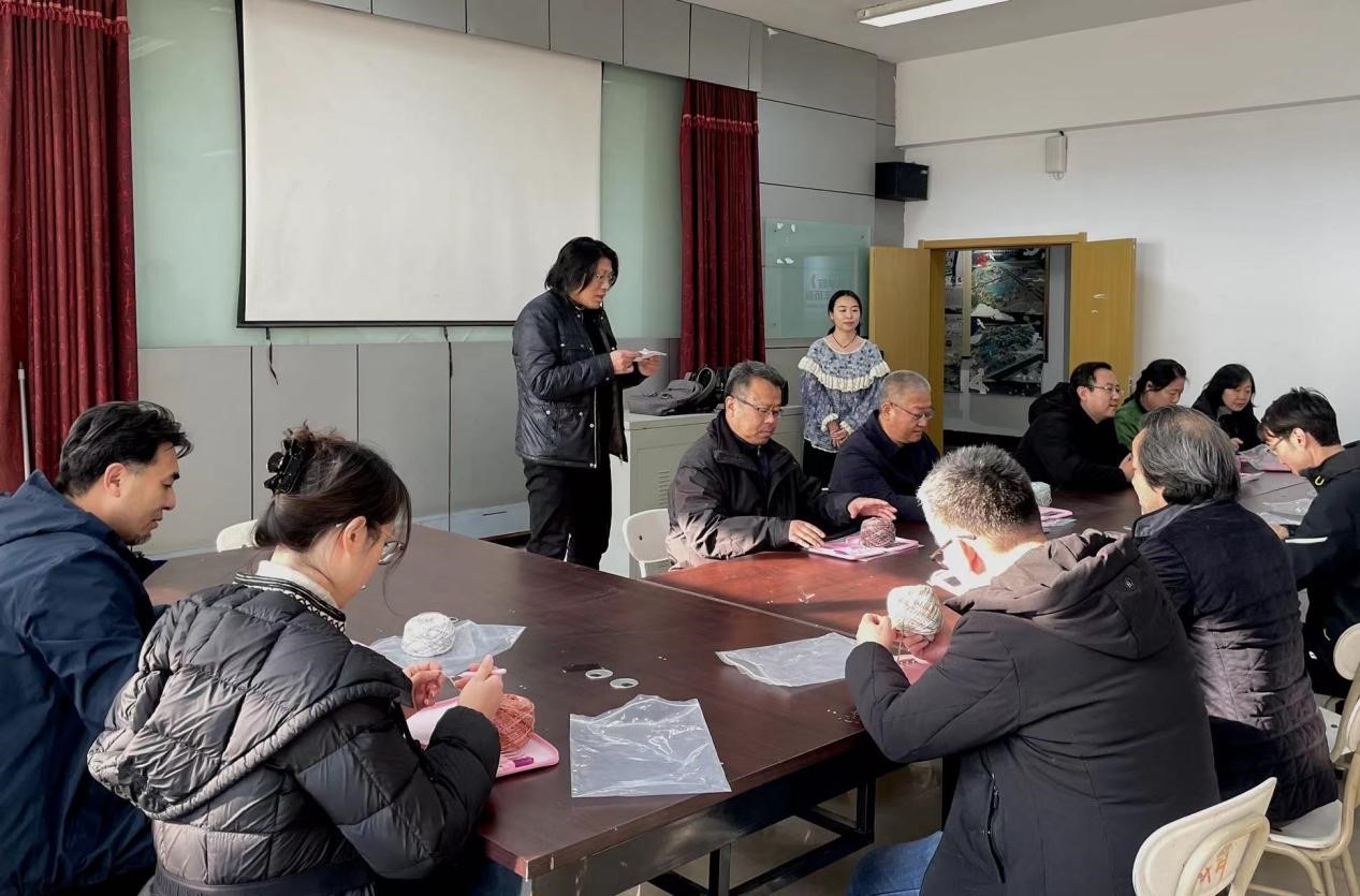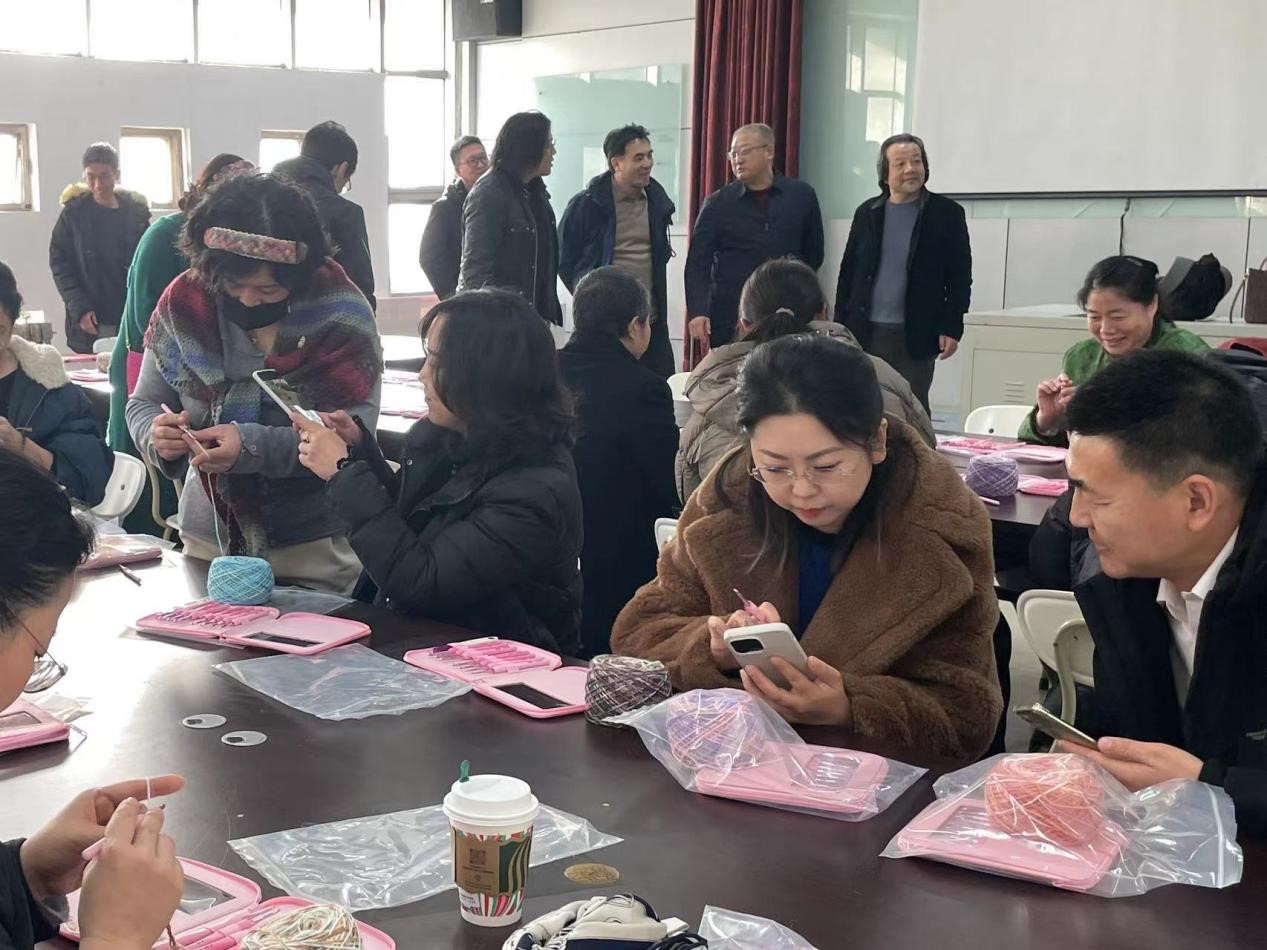 在活动现场,手艺老师边讲解边示范,将复杂的编织技巧通过实际操作和现场指导展示出来,参加学习的老师兴趣浓厚、热情高涨、认真听、仔细学,示范结束后争先上手实践,互相交流心得,对不懂的地方及时向手艺人请教,在三个多小时的活动里,五彩斑斓的细绳,汇聚成扣,勾勒出一段幸福的佳话;翻折汇编的巧手,盘旋交织,弯错着世间万物的无限美好。