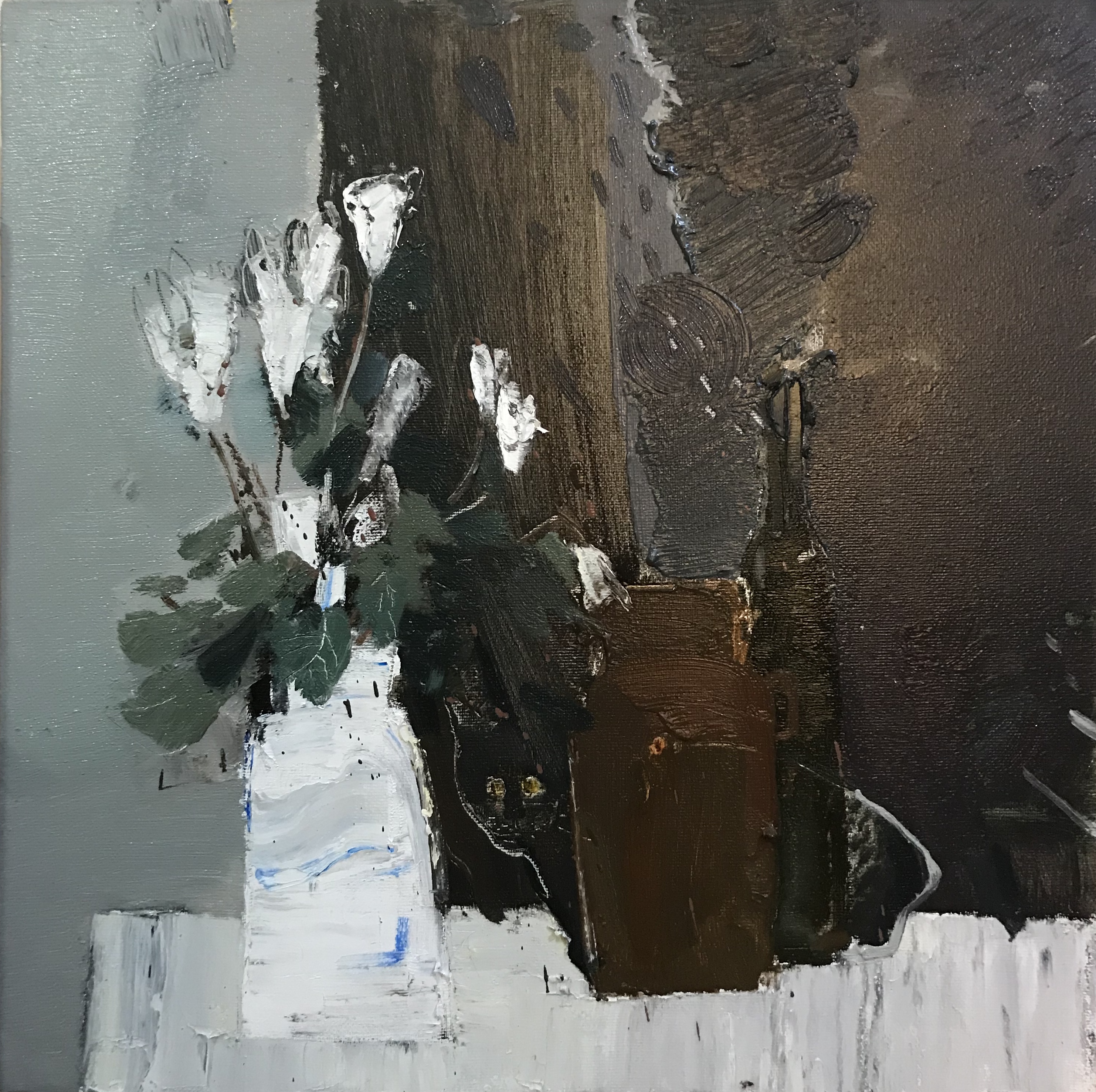 《白花与黑猫》刘玮布面油画70cm×70cm